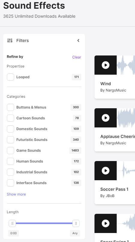- Звуковые эффекты - здесь вы увидите такие категории, как кнопки и меню, звуки коробки, домашние звуки, футуристические, игровые, человеческие, индустриальные, городские звуки и т. Д.