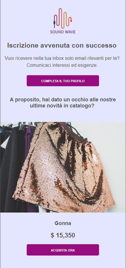 Взяв за основу цвета и стиль страниц, созданных выше, давайте создадим электронное письмо, которое, помимо благодарности подписавшемуся человеку, предлагает дополнительную информацию и скидку на их первую покупку. Как мы уже упоминали, это связано с тем, что приветственные письма имеют очень высокий процент открытий, поэтому они позиционируют себя как момент контакта, который нужно использовать, чтобы начать направлять контакт к вашей маркетинговой цели.