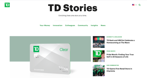 Группа TD Bank иллюстрирует эту концепцию в своих историях TD. Миссия этого контент-хаба состоит в том, чтобы укрепить отношения с клиентами, продемонстрировав, как TD может повысить ценность их жизни, согласно его заявке на получение награды в области контент-маркетинга 2022 года. (TD Stories победила в номинации «Лучшая программа контент-маркетинга в сфере финансовых услуг».)