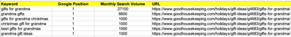 Я не люблю использовать одно и то же слово дважды в заголовке страницы, но здесь это работает. Как видно из приведенной ниже таблицы, URL-адрес https://www.goodhousekeeping.com/holidays/gift-ideas/g4683/gifts-for-grandma/ занимает первое место в категории «подарки для бабушки», «подарки для бабушки, «подарки бабушке на Рождество», «рождественский подарок бабушке», «лучшие подарки бабушке» и «идеи подарков бабушке».
