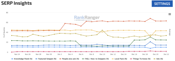 Вы можете получить некоторую информацию от RankRanger, который отображает тенденции в своем инструменте Google SERP Features. На приведенной ниже диаграмме показано, как часто каждый элемент появлялся в поисковой выдаче Google в период с 24 ноября по 22 декабря.