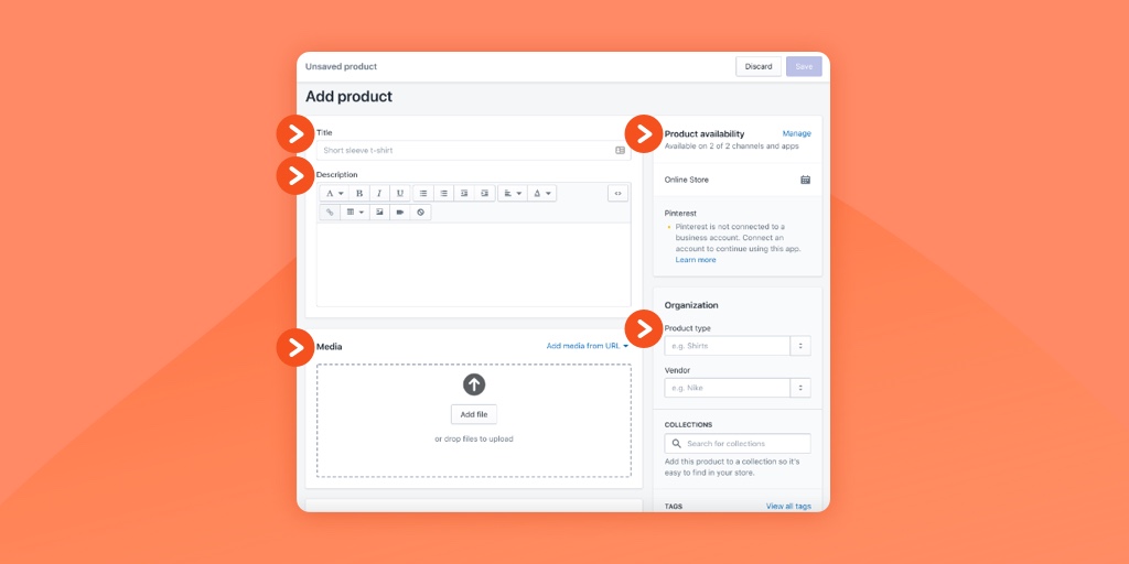 Пины продукта создаются автоматически, когда вы добавляете приложение Pinterest для Shopify в каналы продаж вашего магазина, при условии, что все соответствующие поля заполнены в описаниях ваших продуктов.