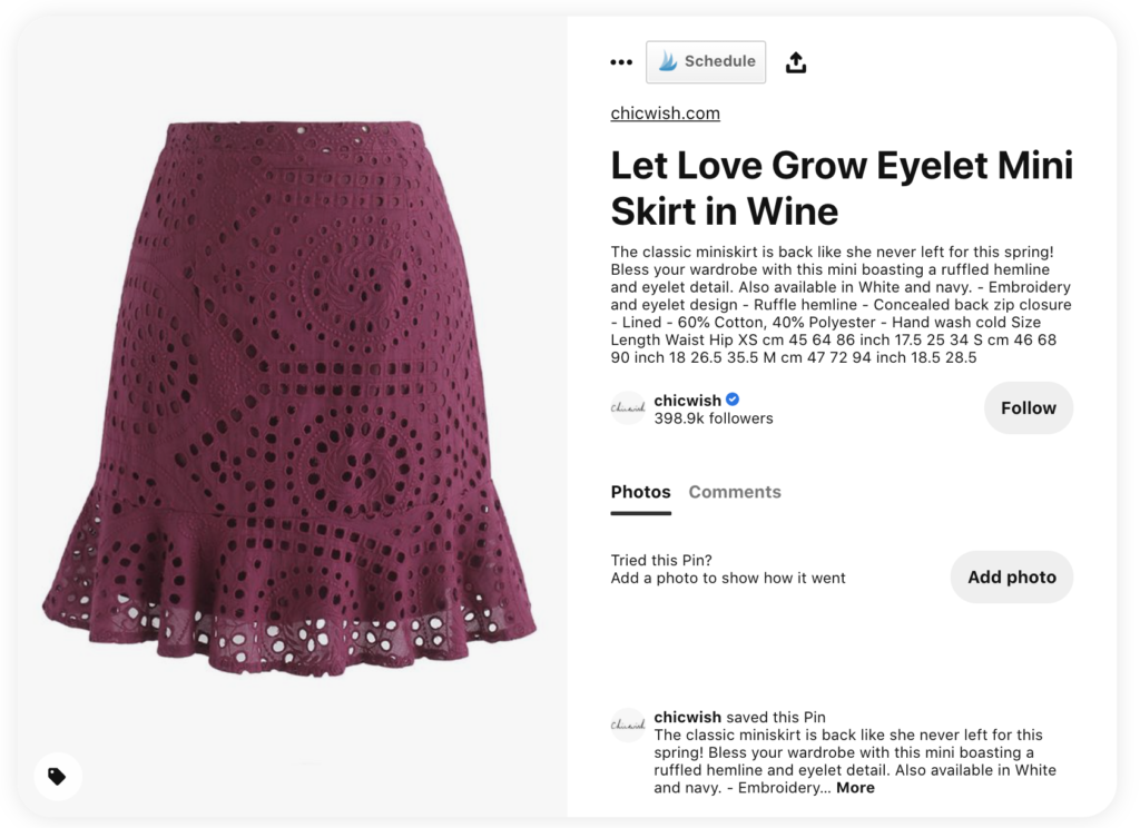 Первые 30-60 символов, скорее всего, будут предварительно показаны в ленте Pinterest, поэтому вам следует использовать это пространство, чтобы привлечь внимание и зацепить вашу целевую аудиторию. Описания продуктов, которые продают, вызывают у потребителя достаточно интереса, чтобы он продолжал читать.