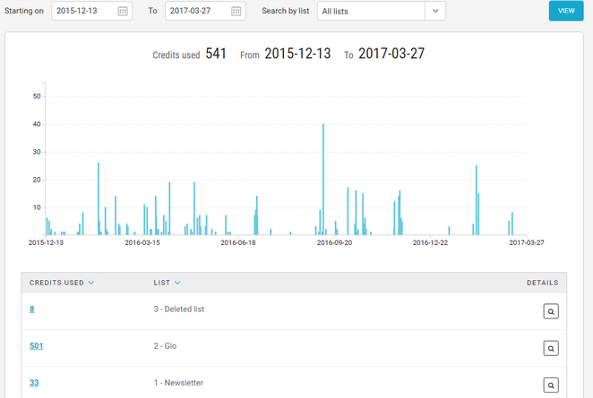 В дополнение к отображению графика с количеством кредитов, использованных на отправку, страница будет рассчитывать потребление для каждого списка . Нажав на значок увеличительного стекла, вы можете увидеть подробный список того, сколько кредитов вы использовали для отправки каждого SMS получателям в выбранном списке.