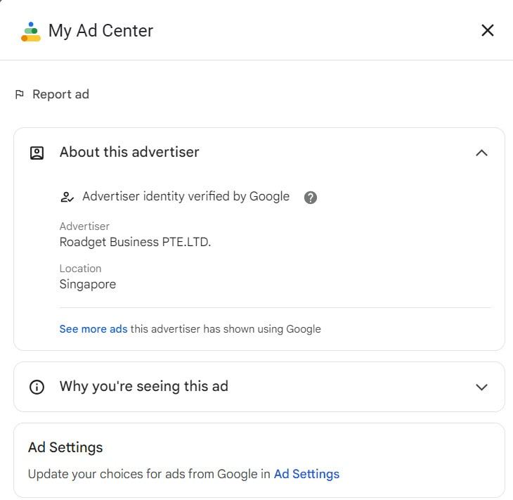 Отследить рекламу конкурентов в Google относительно легко. Введите имя вашего конкурента в поиске Google. Найдите объявление и нажмите три точки. Вы найдете отчет по рекламе с информацией о рекламодателе. Затем нажмите «Посмотреть больше объявлений, которые этот рекламодатель показал с помощью Google».