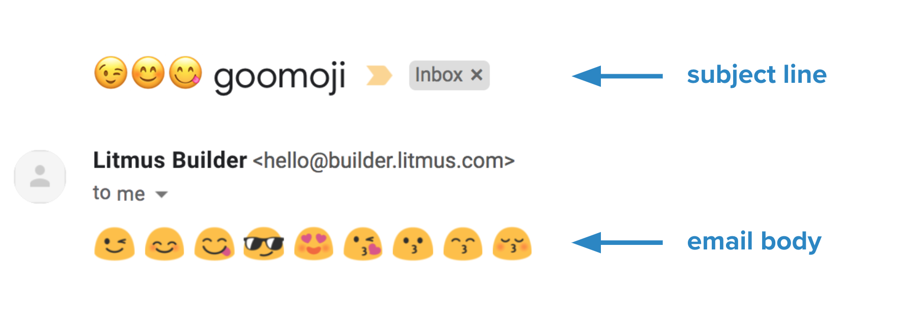 Смайлы в строках темы в режиме просмотра входящих сообщений больше не отображаются как Goomojis, но отображаются как смайлы по умолчанию в операционной системе подписчика. Подписчики, открывающиеся на iOS, теперь видят стандартные смайлы Apple, появляющиеся, например, в строках темы в Gmail.