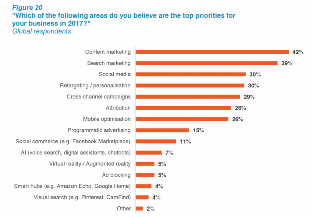 Как упоминалось выше, цифровые рекламодатели в основном озабочены установлением приоритетов в отношении основ маркетинга в 2017 году, при этом контент-маркетинг (указано 42% рекламодателей), поисковый маркетинг (указано 39%) и социальные сети (30%) занимают первое место среди рекламодателей ». список приоритетов на 2017 год.