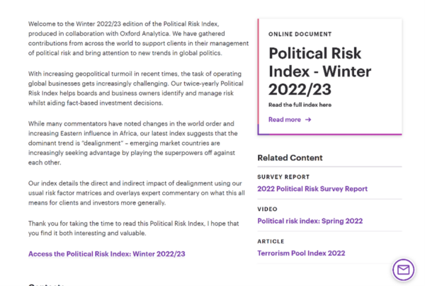 #ThoughtLeadership помогает маркетинговому бюджету двумя способами: повысить осведомленность и привлечь потенциальных клиентов, говорит @JanieJaniehulse через @CMIContent. Нажмите, чтобы твитнутьПример: Хорошо разработанные программы лидерства в области интеллектуального развития привлекают больше внимания благодаря распространению информации в СМИ и мероприятиям по повышению осведомленности, а также генерируют релевантные бизнес-лидеры. Страховая компания Willis Watson Towers делает и то, и другое в своем ежегодном Индексе политических рисков. Посетители могут просмотреть информационный центр с кратким изложением исследования, получить доступ к визуально впечатляющей электронной книге и зарегистрироваться, чтобы получить полный отчет, который был создан для привлечения потенциальных клиентов.