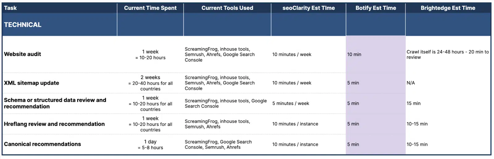 ScreamingFrog помогает в техническом аудите, Botify интегрируется с Semrush для улучшения контента, а seoClarity предлагает рекомендации по оптимизации и функции совместной работы.