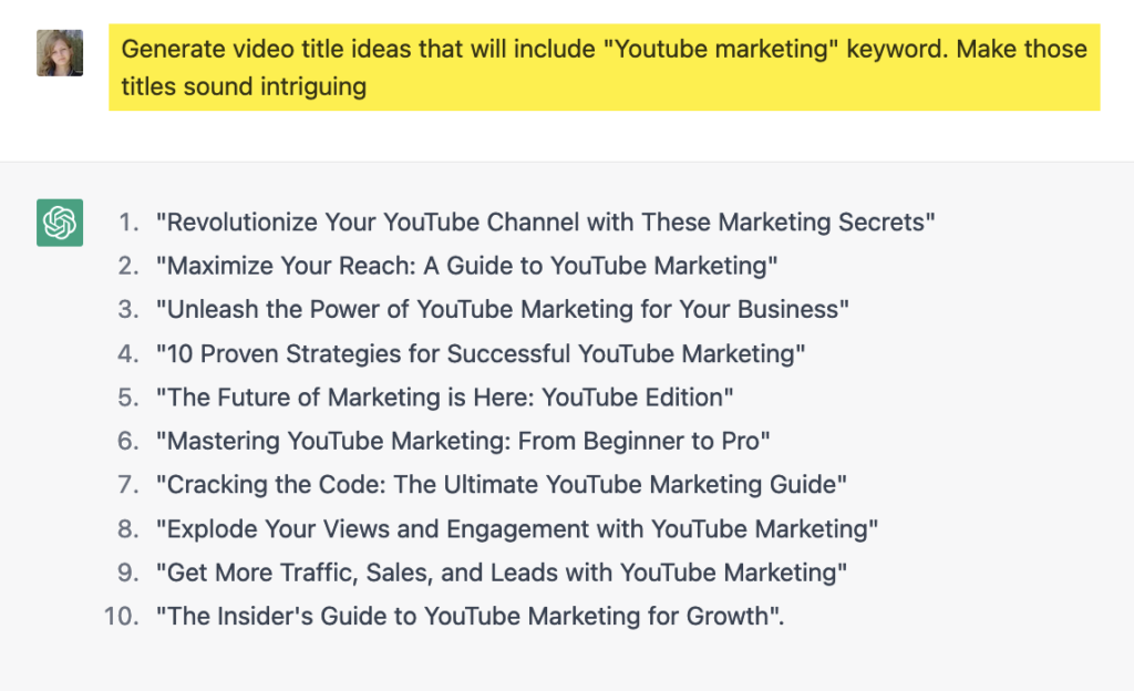Использование ChatGPT поможет вам найти некоторые идеи, если вы застряли. Вот что инструмент смог сгенерировать, когда я запросил следующее: « Создайте идеи для названий видео, которые будут включать ключевое слово «маркетинг на YouTube». Заставьте эти заголовки звучать интригующе :