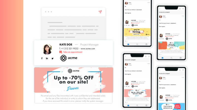 - ลายเซ็นอีเมลทำให้สามารถใช้แบนเนอร์ส่วนบุคคล กำหนดเป้าหมายและไม่ล่วงล้ำเพื่อโปรโมตแบรนด์และผลิตภัณฑ์ของคุณ