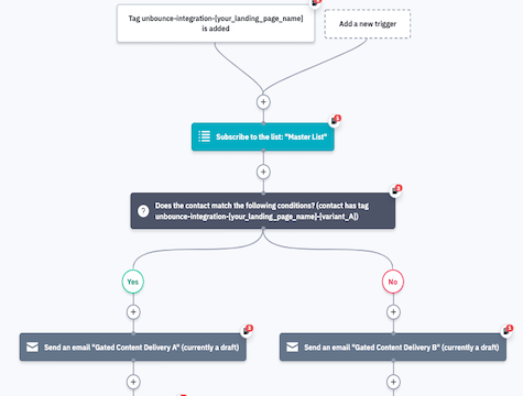 - An If/Else condition checks if your Unbounce form tagged your contact with Variant A. If you're testing out more than two variants, create more If/Else actions and messages.