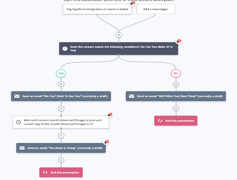 - ระบบอัตโนมัติจะทำงานเมื่อผู้ติดต่อกรอกแบบฟอร์มตอบกลับกิจกรรมของคุณ ในตัวอย่างของเรา เราใช้การรวม Typeform แต่คุณสามารถปรับการทำงานอัตโนมัติให้ทำงานกับการรวมแบบฟอร์มใดก็ได้
