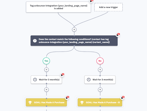 When a contact submits your Unbounce form, Unbounce tags them based on which variant they submitted. Use this automation to track which form leads to more conversions. You can use goal reporting to see whether more contacts with tag Variant A or tag Variant B met the goal step in the automation.