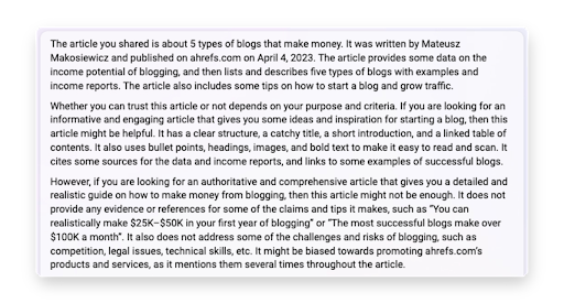 เรายังคาดหวังให้เครื่องมือค้นหาใช้ AI เพื่อทำความเข้าใจคุณภาพของเนื้อหาได้ดียิ่งขึ้น เพื่อให้เป็นตัวอย่างในชีวิตจริง เราขอให้ Bing AI ประเมินคุณภาพของ บล็อกโพสต์ เกี่ยวกับบล็อกทำเงิน: