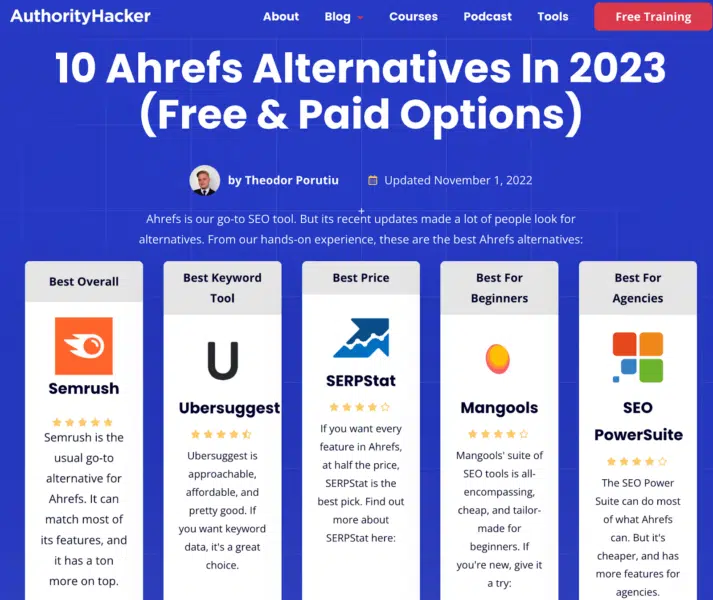 ตัวอย่างจาก AuthorityHacker นี้แสดงรายการทางเลือก Ahrefs ที่อาจเป็นเป้าหมายการเข้าถึงสำหรับผลิตภัณฑ์ SEO SaaS ใหม่