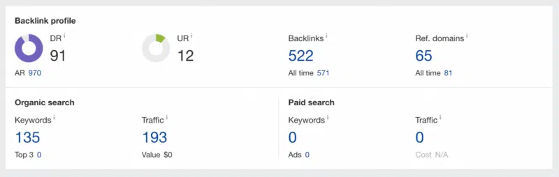 เมื่อเสียบ URL กรณีศึกษาเข้ากับ Ahrefs Site Explorer ฉันพบว่าบทความได้รับลิงก์จาก 65 โดเมนอ้างอิงที่ไม่ซ้ำกัน