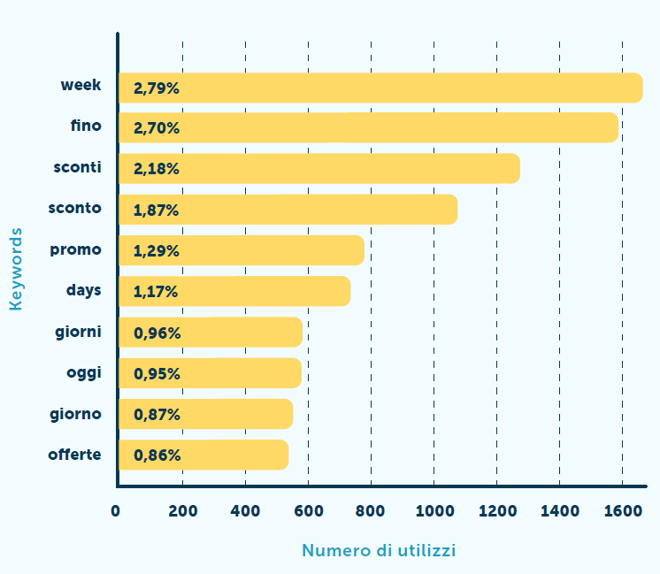 การวิจัยมุ่งเน้นไปที่แนวโน้มและตัวชี้วัดมากมาย อย่างไรก็ตาม การวิเคราะห์คำหลักที่บริษัทต่างๆ ใช้เพื่อให้ได้หัวข้อที่ส่งผลกระทบ สมควรได้รับการกล่าวถึงเป็นพิเศษ คำหลักที่ใช้มากที่สุดคือ "สัปดาห์" โดยมีการทำซ้ำ 1,647 ครั้ง โดยทั่วไปแล้ว ใน 10 อันดับแรก ไม่มีคำหลักที่เป็นต้นฉบับหรือผิดปกติโดยเฉพาะ คำต่างๆ สะท้อนแนวคิดของข้อเสนอ เช่น "โปรโมชั่น" "ส่วนลด" "ข้อเสนอ" หรือแนวคิดของระยะเวลา เช่น "วัน" และ "วันนี้"