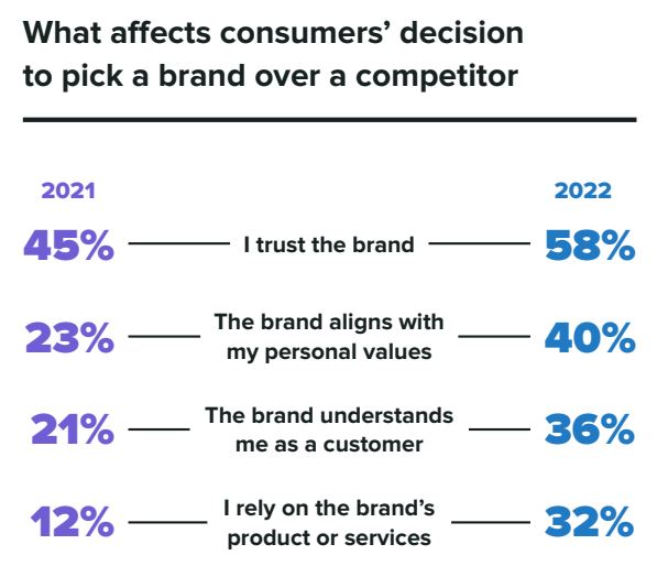 ตามดัชนี Sprout Social Index 2022 การจัดตำแหน่งบริษัทด้วยค่านิยมส่วนบุคคลมีความสำคัญต่อผู้บริโภคมากกว่าในปี 2564 ถึง 74% ผู้คนต้องการรู้ว่าเงินดอลลาร์ของพวกเขาทำมากกว่าเพียงแค่ซื้อผลิตภัณฑ์หรือบริการ พวกเขาต้องการใช้จ่ายกับแบรนด์ที่ยืนหยัดเพื่อสิ่งที่สำคัญ