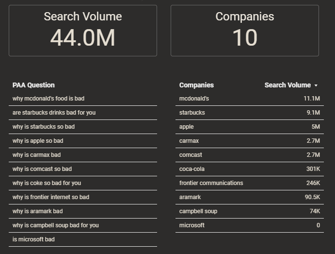 สิ่งที่น่าอึดอัดใจที่ทำให้ฉันประทับใจในระหว่างกระบวนการนี้คือผลลัพธ์ของ PAA ดูเหมือนจะไม่สัมพันธ์กับความสนใจในการค้นหาของผู้ใช้จริงและขับเคลื่อนโดยเนื้อหาที่พร้อมใช้งานออนไลน์มากขึ้น “ทำไมโค้กถึงแย่สำหรับคุณ” มีการค้นหา 20 ครั้งต่อเดือนและปรากฏบนแบรนด์ที่มีการค้นหาแบรนด์ต่อเดือนหลายล้านครั้ง “ทำไมแอปเปิ้ลถึงแย่จัง” มีการค้นหาโดย 70 คนต่อเดือน แต่อาจมีผู้ค้นหาหลายสิบล้านคนต่อเดือน “Walmart กำลังปิดตัวลงจริงๆ” มีการค้นหาศูนย์ครั้งต่อเดือนและปรากฏบนแบรนด์ที่มีการค้นหา 55 ล้านครั้งต่อเดือน ในการสำรวจรายละเอียดเพิ่มเติม เราได้เพิ่มมุมมองไปยังแดชบอร์ด Data Studio ที่เรียกว่า “PAA Search Volume and Sentiment” ซึ่งแสดงให้เห็นว่าสำหรับบริษัทส่วนใหญ่โดยรวม ปริมาณการค้นหา PAA US ที่รวมกันนั้นน้อยกว่า 500