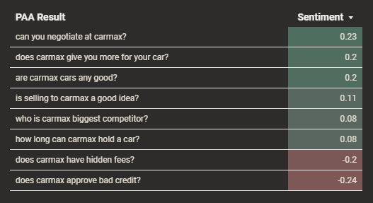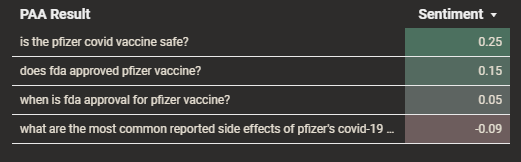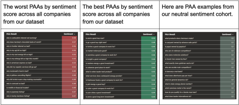 จากนั้นเราดึงคะแนนการเปรียบเทียบโดยใช้ API ภาษาของ Google เพื่อประมวลผลคำถาม PAA Google มีความสามารถในการร้องขอความรู้สึกตามเอนทิตี แต่เราตัดสินใจไม่ใช้มันเป็นการติดป้ายกำกับของบริษัทต่างๆ อย่างถูกต้อง เนื่องจากดูเหมือนว่าหน่วยงานต่างๆ จะได้รับผลกระทบหรือพลาดไป นอกจากนี้ เราละเว้นขนาดในเอาต์พุต เนื่องจากไม่มีค่าที่เท่ากันในเอาต์พุต Senta ของเรา ขนาดคือความแข็งแกร่งโดยรวมของความเชื่อมั่น