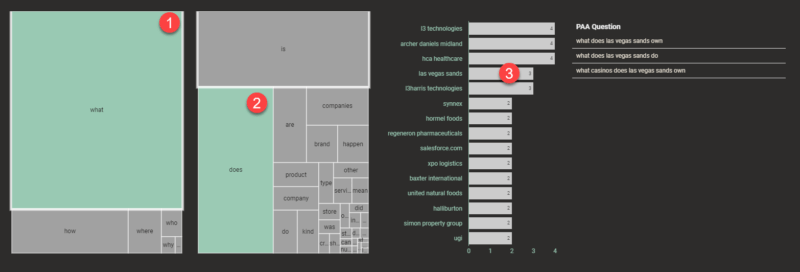 มุมมองต่อไป การสำรวจคำถาม PAA เป็นเรื่องสนุกเล็กน้อย เนื่องจากเราได้จัดหมวดหมู่ผลลัพธ์ PAA ตามธีมและตามประเภทคำถาม เราจึงสร้างเครื่องมือที่ช่วยให้คุณสร้างวลีคำถามเพื่อเข้าถึงคำถามเฉพาะของบริษัท ในภาพด้านล่าง เมื่อคลิก (1) คุณจะถูกถามโดยอัตโนมัติพร้อมตัวเลือกการปรับแต่งที่เป็นไปได้ถัดไปให้คลิก (2) จากนั้นคุณสามารถคลิก (3) เพื่อดูคำถามของบริษัทที่ตรงกับรูปแบบที่คุณเลือก