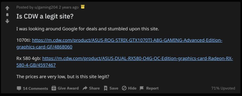 คำถามก็คือ สิ่งนี้เป็นสิ่งที่ดีหรือไม่ดี? ฉันเห็นประโยชน์สำหรับผู้ใช้ที่ไม่ทราบว่า CDW เป็นผู้ค้าปลีกเทคโนโลยี B2B ที่เชื่อถือได้มาตั้งแต่ปี 1984 แต่ฉันยังเห็นปัญหาจากฝั่งของ CDW ในเรื่องที่ว่านี่อาจเป็นข้อสงสัยบางๆ ที่แทรกอยู่ในจิตใต้สำนึกของลูกค้าซ้ำแล้วซ้ำเล่า 135,000 ครั้งต่อเดือน นอกจากนี้ยังยุติธรรมที่จะชี้ให้เห็นว่าคำถามนี้มีคำตอบสำหรับผู้ที่มีปัญหา