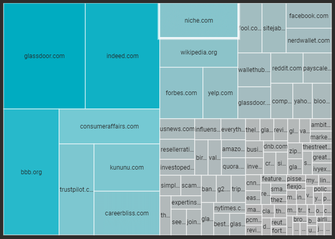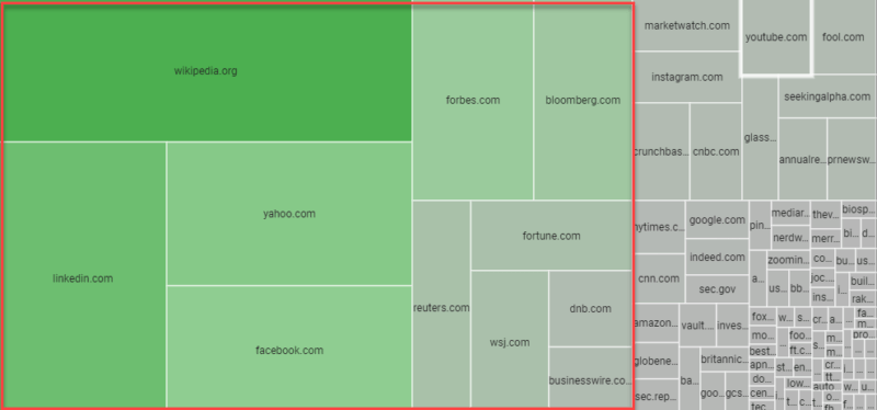ส่วนแบ่งโดเมนของเสียง เป็นเรื่องที่น่าตกใจที่ได้เห็น แต่ในมุมมองแรก เราเห็นว่าบางโดเมนมีส่วนแบ่งการมองเห็น 10 อันดับแรกจากการค้นหาแบรนด์ของบริษัททั้งหมด 500 รายการ Wikipedia มีอยู่ใน 97.4% ของผลการค้นหาทั้งหมด Linkedin เป็นวินาทีที่ห่างไกล แต่น่าประทับใจที่ 75%