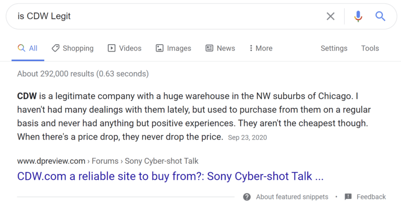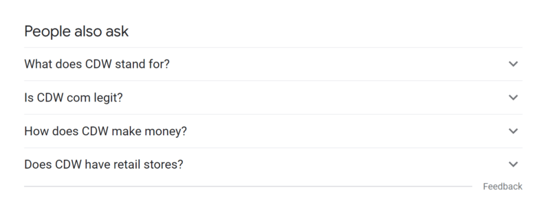 สำหรับบริษัทหลายแห่ง ผลลัพธ์ PAA มีตำแหน่งที่โดดเด่นในผลการค้นหาของ Google และ Bing สำหรับการค้นหาแบรนด์ส่วนใหญ่หรือเกือบทั้งหมด ในภาพด้านบน นี่คือผลลัพธ์สำหรับการค้นหา “CDW” คำว่า “CDW” มีปริมาณการค้นหา 135,000 การค้นหาในสหรัฐอเมริกาต่อเดือน หมายความว่าการค้นหาส่วนใหญ่เหล่านั้นอาจเห็นว่า “CDW.com ถูกกฎหมายหรือไม่” ทุกครั้งที่ต้องการเข้าเว็บไซต์ของ CDW