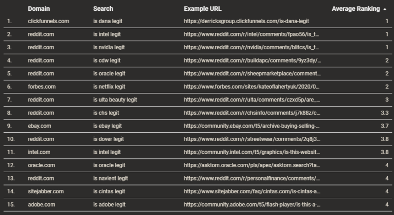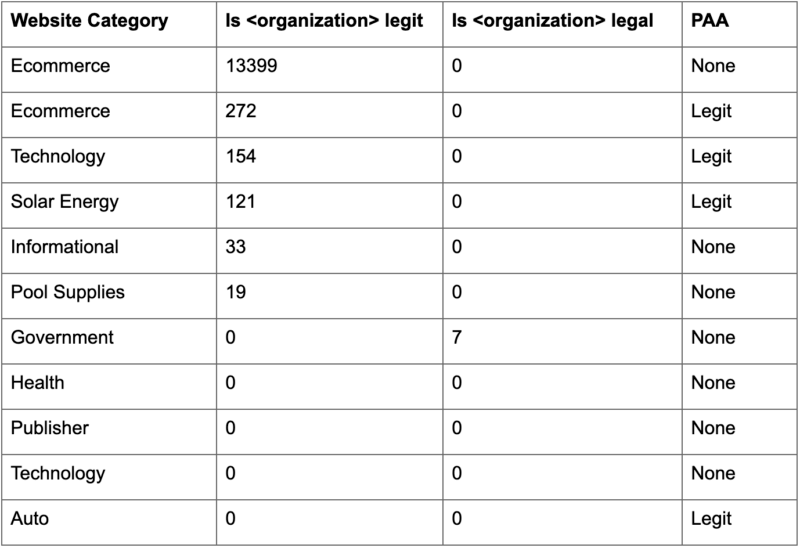 กล่าวโดยสรุป ฉันยังไม่แน่ใจว่าจะรู้สึกอย่างไรเกี่ยวกับ Google ที่แสดงเนื้อหาที่ตั้งคำถามถึงความถูกกฎหมายหรือความชอบธรรมของบริษัทต่างๆ ในการค้นหาแบรนด์แบบนำทาง ด้านล่างนี้คือตารางดั้งเดิมที่ฉันรวบรวมจากเว็บไซต์ที่เราเข้าถึงได้ใน Google Search Console ค่าตัวเลขคือการแสดงผลวลี 12 เดือน (หรือวลีที่คล้ายกัน) ใช่ มีบางครั้งที่บริษัทเพิ่งออกสู่ตลาดซึ่งคำถามนั้นอาจมีความสำคัญสำหรับผู้ใช้ ฉันไม่แน่ใจว่าผู้ขายเทคโนโลยีที่มีอายุ 30 ปีขึ้นไปควรได้รับการปฏิบัติแบบเดียวกัน