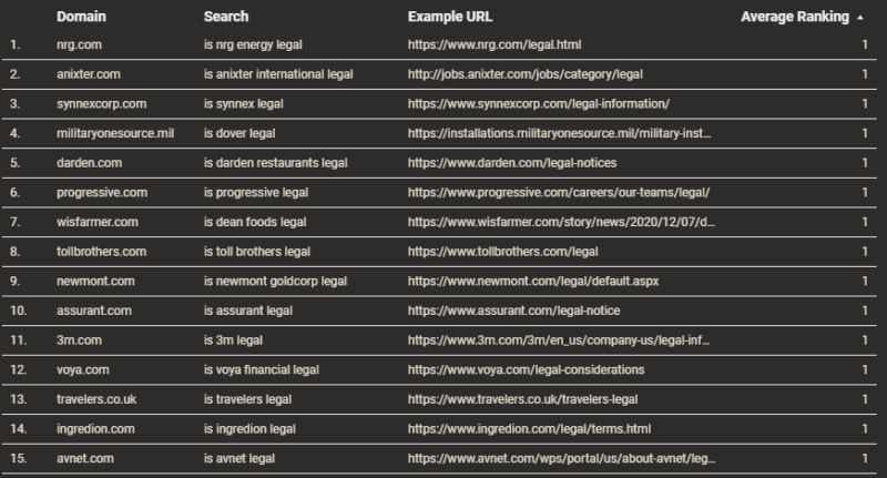 สุดท้าย เราได้ตั้งค่าการติดตามอันดับใน Nozzle สำหรับทั้ง 500 บริษัท เพื่อตรวจสอบเว็บไซต์ที่จัดอันดับว่า "ถูกกฎหมายหรือไม่" และ "ถูกกฎหมายหรือไม่" แบบสอบถามเพื่อดูว่าเราสามารถระบุได้ว่าโดเมนบางโดเมนขับเคลื่อนเนื้อหานี้หรือไม่ นอกจากนี้ เราดึงข้อมูลการเปลี่ยนแปลงรายได้จากบริษัทที่ติดอันดับ Fortune 500 ในปีนี้เพื่อใช้เป็นอีกชั้นหนึ่งเพื่อเปรียบเทียบผลกระทบต่อความเชื่อมั่น