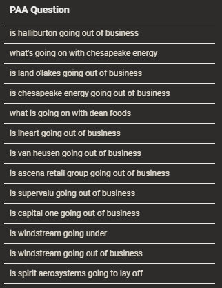 ข้อสังเกตอีกอย่างหนึ่ง ฉันเริ่มตรวจสอบเรื่องนี้หลังจากเห็นว่า "ถูกต้องหรือไม่" ในการค้นหาบริษัทหลายแห่ง อันที่จริง ในผลลัพธ์ของ PAA ที่รวบรวมจากบริษัททั้งหมด 500 แห่ง มีเพียงแปดผลลัพธ์ที่ตั้งคำถามเกี่ยวกับความถูกกฎหมายของบริษัท: