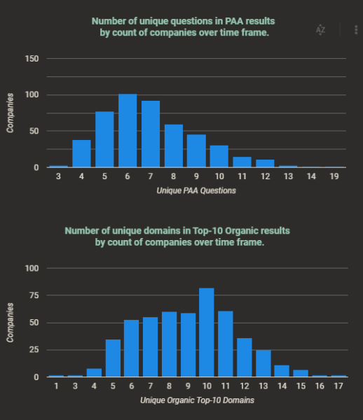 จำนวนเฉลี่ยของผลลัพธ์ PAA ที่ไม่ซ้ำกันต่อบริษัทคือเจ็ดในช่วงเกือบสองสัปดาห์ที่เราเก็บรวบรวมข้อมูล จำนวนเฉลี่ยของโดเมน 10 อันดับแรกที่ไม่ซ้ำกันคือ 10 โดเมนในช่วงเวลาเดียวกัน แผนภูมิด้านล่างแสดงการกระจายผลลัพธ์ที่ไม่ซ้ำกันในทุกบริษัท