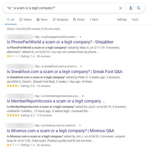 จากข้อความค้นหาที่ "ถูกกฎหมาย" ผลลัพธ์ส่วนใหญ่เป็นเจ้าของโดยไซต์ตรวจสอบธุรกิจและไซต์ตรวจสอบอาชีพ ความโดดเด่นในอาชีพการงานดูเหมือนไม่สอดคล้องกันโดยมุ่งเน้นที่การให้ผู้มีโอกาสเป็นลูกค้าทราบว่าบริษัทเป็นบริษัทจริงหรือไม่ บางทีนี่อาจเป็นคำใบ้ว่านี่เป็นความตั้งใจที่ได้รับความนิยมสำหรับผู้หางาน แม้ว่าฉันจะนึกภาพไม่ออกว่าพนักงานที่มีศักยภาพกำลังค้นหา "ดีที่สุดซื้อถูกกฎหมายหรือไม่"