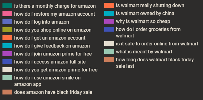 เมื่อดูผลลัพธ์ของ PAA ด้วยเลนส์ของบริษัทออนไลน์เทียบกับบริษัทที่มีหน้าร้านจริง เราพบว่าการเปรียบเทียบระหว่าง Amazon กับ Walmart นั้นมีประโยชน์ที่ชัดเจนสำหรับการสนับสนุนของอีกฝ่ายหนึ่ง