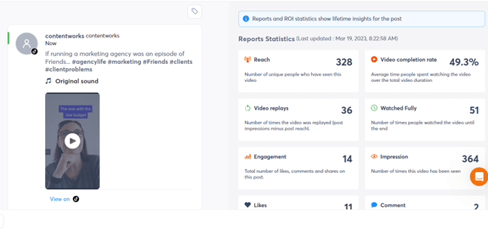 วิดีโอแบรนด์เป็นรูปแบบการตลาดเนื้อหาที่มีส่วนร่วมสูง แต่คุณต้องเจาะลึกสถิติของคุณ ด้วย Agorapulse คุณสามารถดูได้อย่างรวดเร็วว่าได้รับโพสต์วิดีโอของคุณอย่างไร (คลิปวีดีโอหรือเรื่องราว) ด้วยการวิเคราะห์การมีส่วนร่วมระดับบนสุด คุณยังสามารถดูการวิเคราะห์สำหรับ TikTok ซึ่งเป็นส่วนเสริมใหม่ล่าสุดของแดชบอร์ด หากวิดีโอของคุณมีความคิดเห็น อย่าลืมตอบกลับในส่วนที่คุณต้องการ