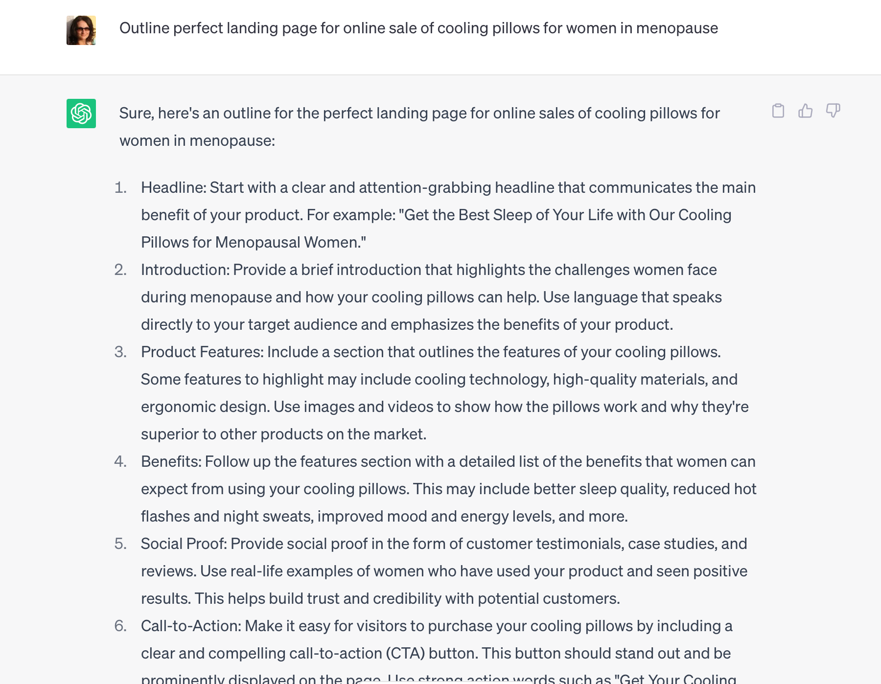 คำแนะนำเชิงสร้างสรรค์ของ ChatGPT ช่วยให้ธุรกิจประหยัดเงินได้มาก ซึ่งหากไม่เช่นนั้นจะต้องนำไปใช้กับนักออกแบบมืออาชีพ คุณสามารถแจ้ง ChatGPT เพื่อขอคำแนะนำองค์ประกอบการออกแบบเฉพาะสำหรับคุณลักษณะใดๆ ก็ตามของหน้า Landing Page ที่คุณต้องการความช่วยเหลือ: