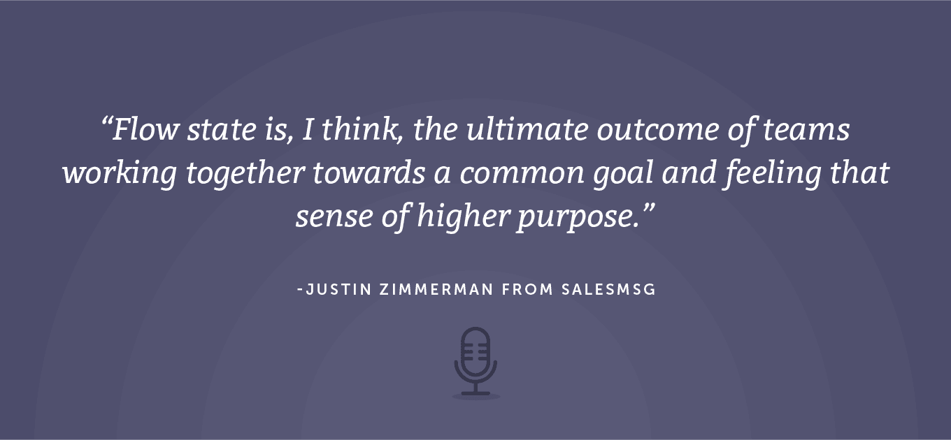 ความต้องการเวิร์กโฟลว์คล้ายกันมาก ลองนึกภาพสองเมืองในโลก หนึ่งในเมืองเหล่านั้นมีช่องทางเดินรถ ทางหลวงห้าเลน เรียกง่ายๆ ว่า Florida I-95—ทั้งทางไหลและทางด่วน ลองนึกถึงเมืองอื่นในโลก เรียกกันว่าบังกาลอร์ ประเทศอินเดีย ไม่มีถนน ไม่มีสัญญาณไฟจราจร ทุกคนไปทั่วทุกที่ แต่ในทั้งสองกรณี คุณมีคนพยายามไปจาก A ไป B พวกเขากำลังพยายามไปให้ถึงจุดหมาย ในสถานการณ์เช่นนี้ คุณได้สังเกตแนวทางปฏิบัติที่ดีที่สุดเกี่ยวกับวิธีการเคลื่อนตัวไปตามทางหลวง จากนั้นคุณมีแนวทางปฏิบัติที่ดีที่สุด 100,000 แนวทางในการเคลื่อนตัวไปตามทางหลวง ที่จริงแล้ว ความแตกต่างคือ เมื่อคุณมีระบบที่ทุกคนเห็นพ้องต้องกันและสร้างขึ้นมาโดยปริยาย คุณจะรู้สึกถึงความลื่นไหล สำหรับฉัน ความรู้สึกของการไหล เวิร์กโฟลว์—งานและการไหล—เชื่อมโยงกับหลักการทางจิตวิทยาของการไหลโดยนักจิตวิทยา [...] ที่พูดถึงการอยู่ในสถานะการไหล ฉันคิดว่าสถานะโฟลว์คือผลลัพธ์สุดท้ายของทีมที่ทำงานร่วมกันเพื่อบรรลุเป้าหมายร่วมกันและรู้สึกถึงจุดประสงค์ที่สูงขึ้น สำหรับฉัน ไม่ว่าจะเป็นเนื้อหา กีฬา หรือการขาย เมื่อคุณมีทีม เป้าหมายสูงสุดอย่างที่พวกเขาพูด ให้เน้นที่กระบวนการ (มีคำสกปรกนั้นอีกแล้ว) มุ่งเน้นไปที่กระบวนการและผลลัพธ์จะปรากฏขึ้น