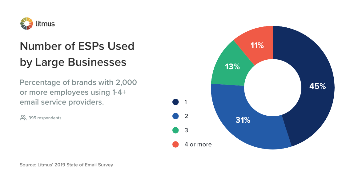 แล้วเราก็มีธุรกิจขนาดใหญ่ บริษัทพนักงาน 2,000+ แห่งเหล่านี้มีแนวโน้มที่จะใช้ ESP สี่ตัวหรือมากกว่ามากกว่าบริษัทขนาดเล็ก โดย 11% ของผู้ตอบแบบสำรวจมีเครื่องมือมากมาย