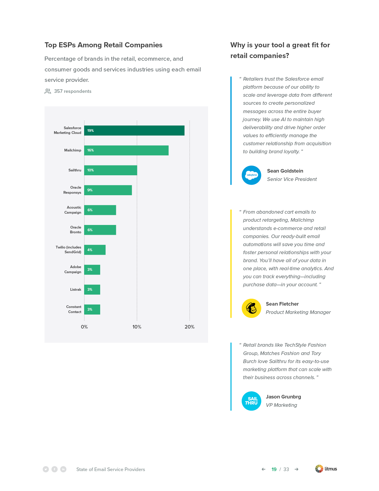 ![]() | ดูว่า ESP ใดได้รับความนิยมมากที่สุดในอุตสาหกรรมของคุณผู้ให้บริการอีเมลรายใดที่ผู้ค้าปลีก องค์กรไม่แสวงหากำไร บริษัทเทคโนโลยี และอื่นๆ ชอบมากกว่า ดาวน์โหลดรายงานสถานะผู้ให้บริการอีเมลของ Litmus เพื่อดูอันดับเฉพาะอุตสาหกรรม รับสำเนาของคุณ → |