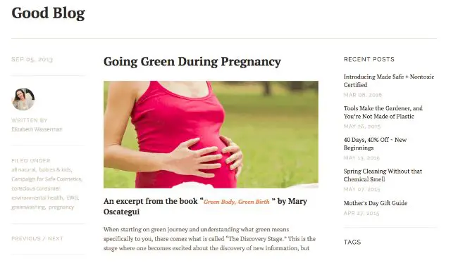 True Goods – ผู้ค้าปลีกออนไลน์สำหรับสินค้าในครัวเรือนและผลิตภัณฑ์ดูแลส่วนบุคคลที่ผลิตจากวัสดุที่ปลอดภัยและยั่งยืน – มักใช้กลยุทธ์ด้านเนื้อหาเพื่อยืนยันการดำรงชีวิตที่สะอาดและความยั่งยืน และถึงแม้ว่า True Goods จะเป็นไซต์อีคอมเมิร์ซ แต่แทบจะไม่มีโพสต์บนบล็อกของบริษัทแม้แต่โพสต์เดียวที่พยายามจะขายอะไรบางอย่างให้คุณอย่างเปิดเผย คุณจะพบบทความที่มีชื่อเช่น "มะเร็งเต้านมที่เชื่อมโยงกับพลาสติก" และ "สิ่งที่คาวกับปลาในฟาร์ม" และ "เป็นมิตรกับสิ่งแวดล้อมในระหว่างตั้งครรภ์" แทน