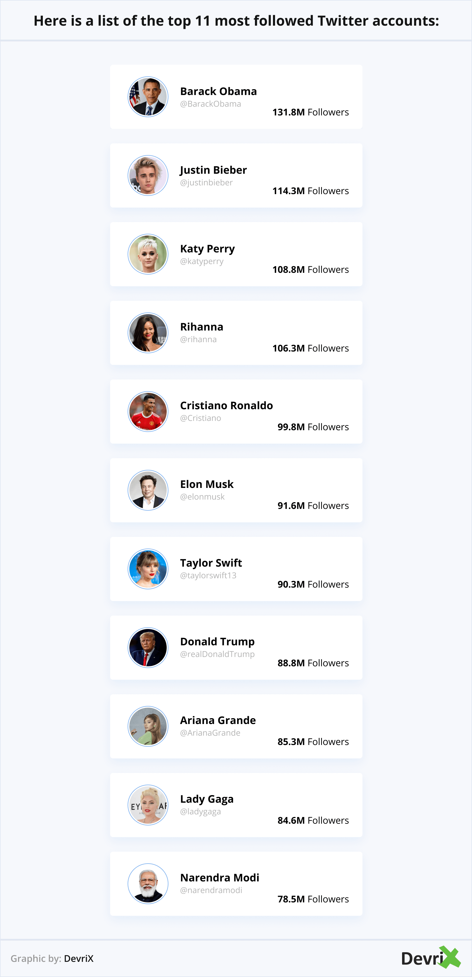 นี่คือรายชื่อบัญชี Twitter ที่มีผู้ติดตามมากที่สุด 11 อันดับแรก:
