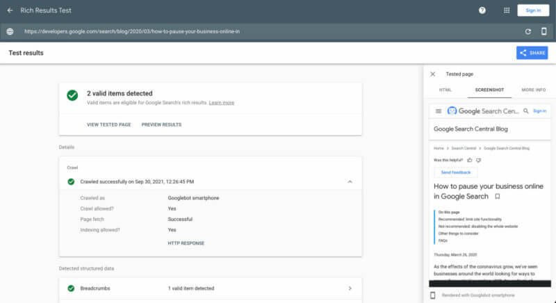 - ภาพหน้าจอของหน้า – หน้าที่แสดงผลตามที่ Google เห็น