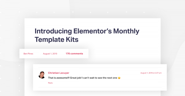 เผยแพร่แล้ว: 2019-09-03เมื่อเดือนที่แล้ว เราได้เปิดตัวชุดเทมเพลต Elementor ชุดแรกประจำเดือนของเรา การตอบสนองจากชุมชนของเรานั้นยอดเยี่ยมมาก ผู้ใช้หลายคนรู้สึกตื่นเต้นกับการเปิดตัวและต้องการเพิ่มเติม: