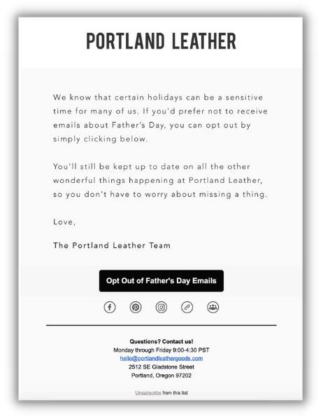 - มีความละเอียดอ่อน วันพ่ออาจเป็นช่วงเวลาที่ซับซ้อนหรือน่าเศร้าสำหรับบางคน โปรดระลึกไว้เสมอเมื่อคุณวางแผนแคมเปญการตลาดในช่วงวันพ่อและกำหนดเวลาข้อความของคุณ