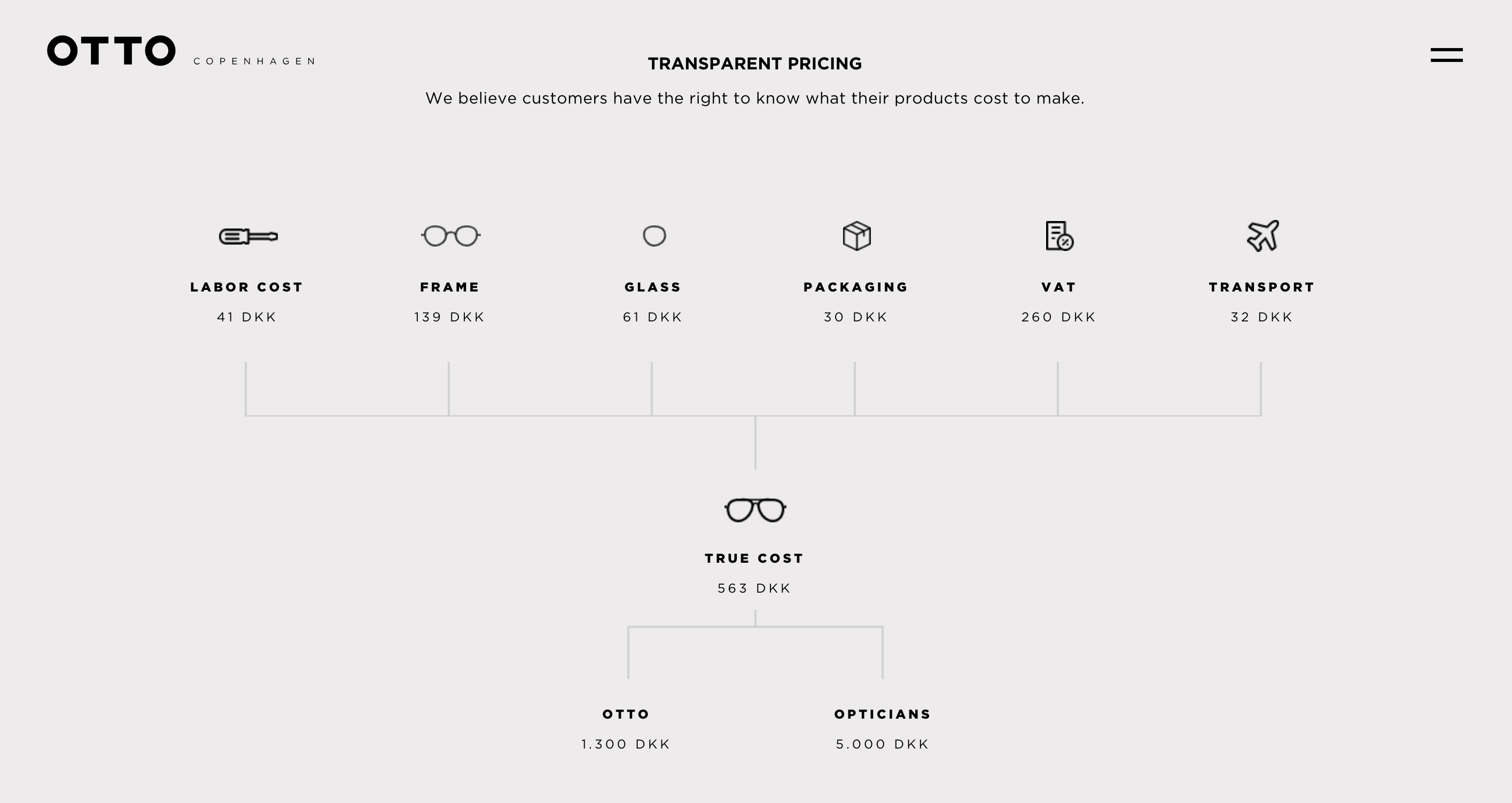 Otto Copenhagen รวมอินโฟกราฟิกเกี่ยวกับสายรัดไว้บนหน้าผลิตภัณฑ์แต่ละหน้า ซึ่งอธิบายโครงสร้างการกำหนดราคาที่โปร่งใส ผู้บริโภคฉลาดและเข้าถึงข้อมูลที่มีค่ามากขึ้นเรื่อยๆ ซึ่งช่วยให้พวกเขามองเห็นราคาที่ผิดจรรยาบรรณ พวกเขาเริ่มตระหนักมากขึ้นถึงวิธีที่บางแบรนด์ใช้มาร์กอัปในทางที่ผิด ดังนั้นพวกเขาจะกระชับความพยายามในการค้นคว้าเพื่อให้แน่ใจว่าพวกเขาจะเลือกข้อตกลงที่ดีที่สุด