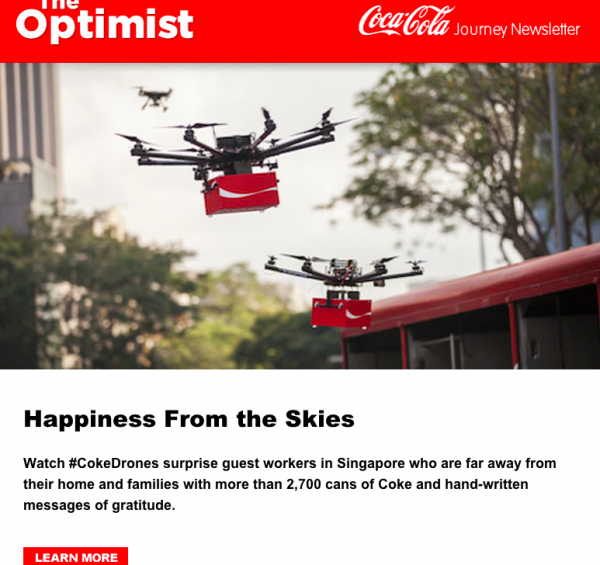 เพื่อแจกแจงวิธีการโปรโมตข้ามเนื้อหาอีเมลของคุณ เราจะใช้ตัวอย่างจาก Coca-Cola ยักษ์ใหญ่ที่โปรโมตข้ามช่อง เมื่อเร็วๆ นี้ บริษัทฯ ได้จัดกิจกรรมการกุศล “ความสุขจากฟากฟ้า” ยักษ์ใหญ่ด้านเครื่องดื่มใช้โดรนควบคุมระยะไกลส่งแพ็คเกจดูแลให้กับคนงานก่อสร้างในสิงคโปร์ บรรจุภัณฑ์บรรจุกระป๋องโค้กพร้อมข้อความแสดงความขอบคุณ