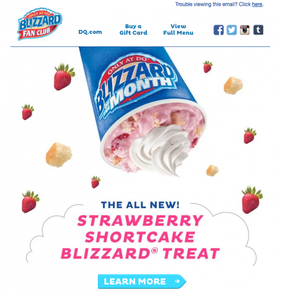 ในความพยายามที่จะโปรโมตพายุหิมะใหม่ Dairy Queen ได้ส่งอีเมลไปยังสมาชิก มันสั้นและหวาน อันที่จริงรูปภาพเป็นผู้ขายหลักที่นี่ คุณสามารถทำสิ่งเดียวกัน ส่งอีเมลเพื่อโฆษณาผลิตภัณฑ์ใหม่หรือโปรโมชั่นที่จะเกิดขึ้น
