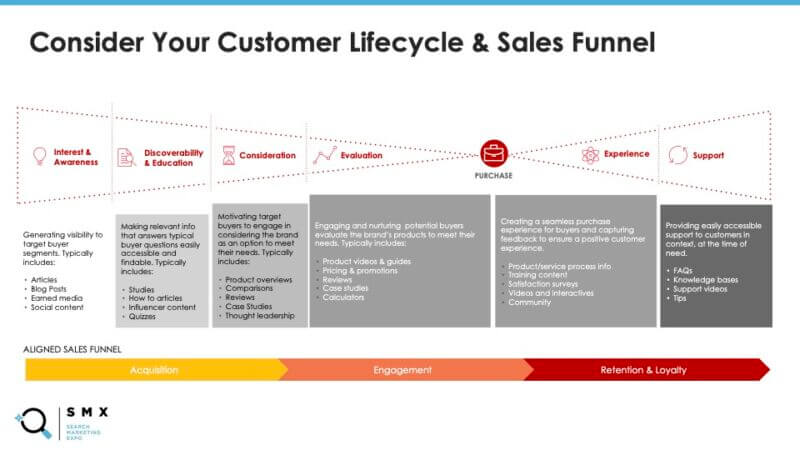 สิ่งที่ผู้ชมมักค้นหาในแต่ละขั้นตอนของช่องทาง “เรามักจะเห็นการสอบถามข้อมูลเมื่อมีคนอยู่ในระยะการรับรู้” เธอกล่าว โดยให้ตัวอย่างคำถามต่อไปนี้ที่ผู้บริโภคด้านบนสุดของช่องทางอาจถาม: “ฉันมีตัวเลือกอะไรบ้าง ผู้คนพูดถึงตัวเลือกเหล่านั้นอย่างไร คนอื่นๆ ในตลาดรู้สึกอย่างไรกับข้อมูลที่องค์กรนี้นำเสนอ”