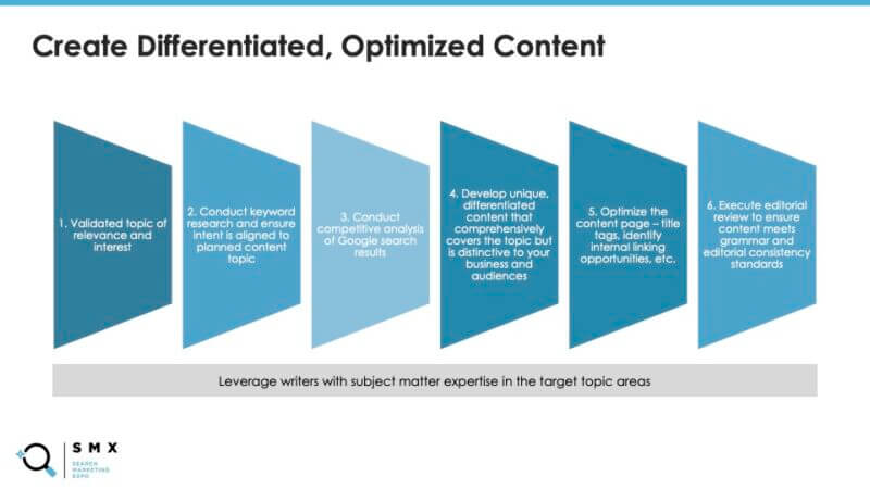 หลังจากที่คุณได้รวบรวมบทสรุปเนื้อหาของคุณแล้ว (ซึ่งได้รับแจ้งจากบุคคล แผนที่การเดินทาง การวิจัยคำหลัก และการวิเคราะห์การแข่งขัน) ก็ถึงเวลาส่งต่อให้ผู้เขียนหรือผู้สร้างเนื้อหาของคุณ “ตรวจสอบให้แน่ใจว่าผู้เขียนของคุณมีความรู้และความเชี่ยวชาญในการเขียนเกี่ยวกับหัวข้อเหล่านั้น เพราะความแตกต่างของวิธีการเขียนเกี่ยวกับเรื่องนี้กับผู้เขียนทั่วไปที่เพิ่งทำวิจัยด้วยตัวเองสามารถผ่านเข้ามาและส่งผลกระทบต่อเนื้อหาได้อย่างแท้จริง” Sangenito กล่าว